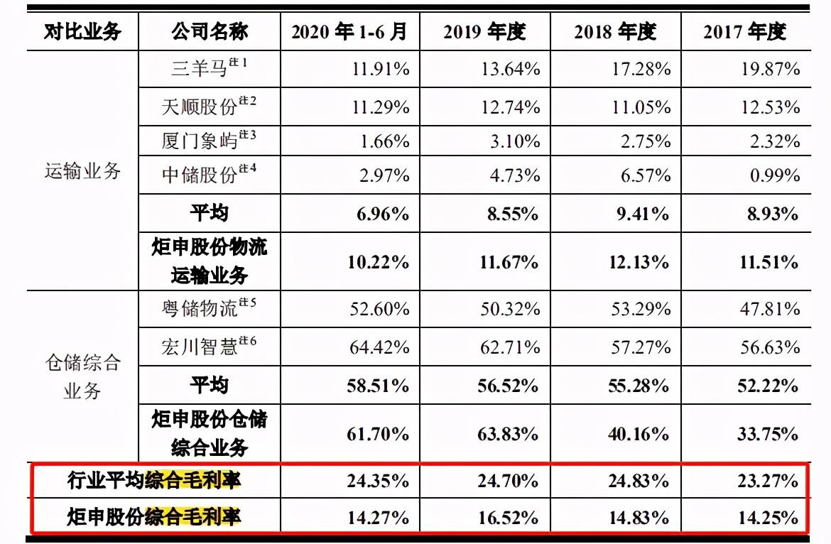 炬申物流的主营业务分为仓储综合业务和物流运输业务,炬申物流在招股书中解释称,公司仓储综合业务和物流运输业务的毛利率水平与行业平均水平基本持平,综合毛利率较低是由于业务结构差异所致。