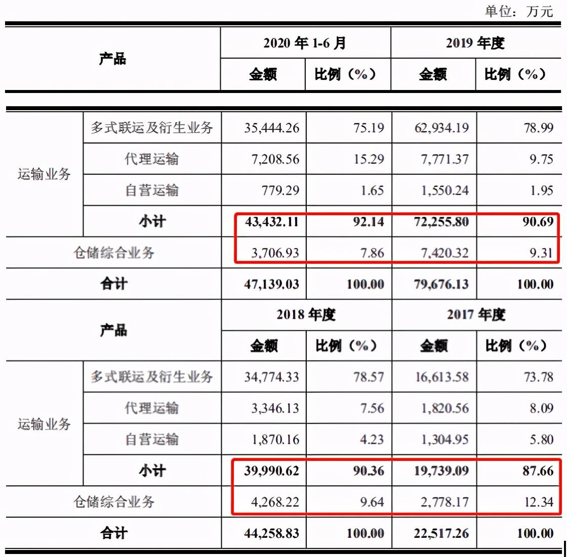 发现网研究发现,2017年-2020年上半年,炬申物流运输业务收入分别为1.97亿元、4.00亿元、7.23亿元和4.34亿元,占当期主营收入的比例分别为87.66%、90.36%、90.69%和92.41%,而仓储综合业务收入分别为2778.17万元、4268.22万元、7420.32万元和3706.93万元,占当期主营收入的比例分别为12.34%、9.64%、9.31%和7.86%。炬申物流的主营收入主要依靠物流运输业务。