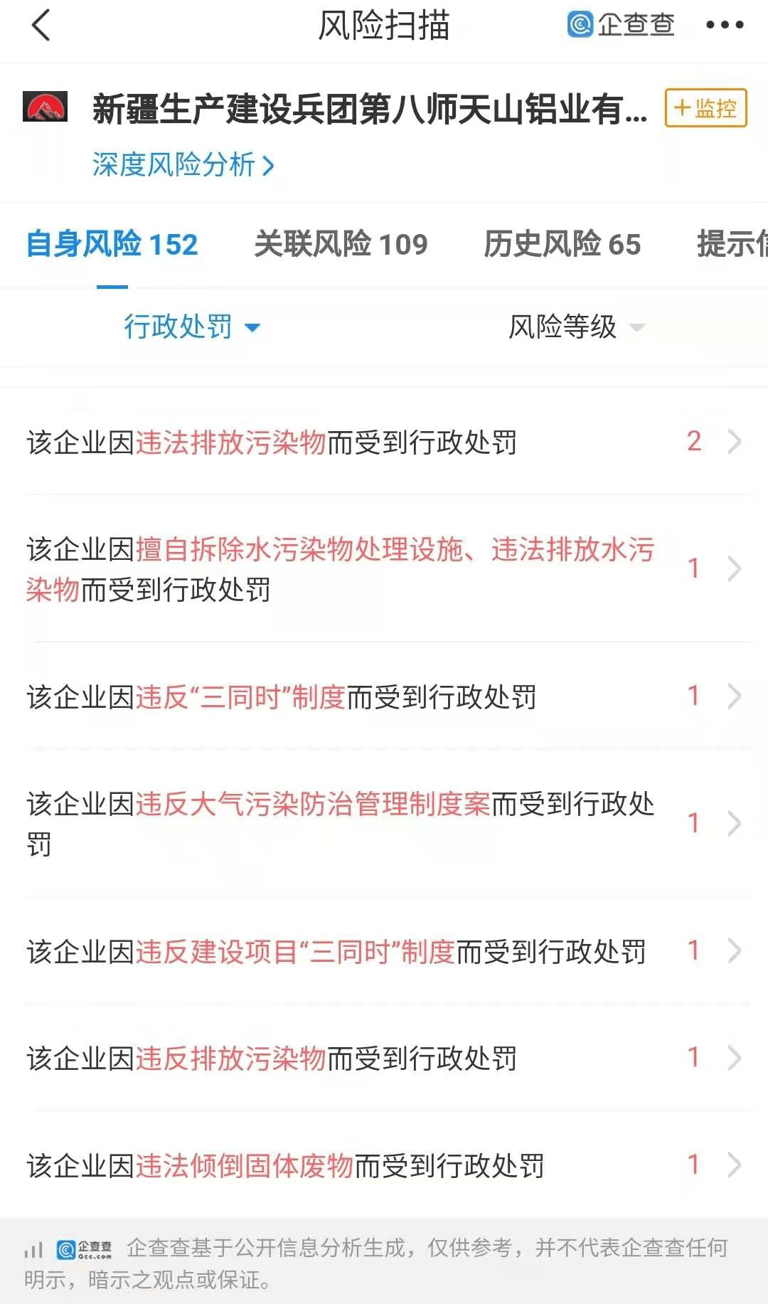 据发现网了解,天山铝业成立于2010年8月,是一家铝产品生产商。近年来,国家对环保要求愈发严格,因此对包括电解铝在内的环境污染型企业的监管程度不断提升。企查查显示,天山铝业因违规排放污染物、擅自拆除水污染物处理设施和违反“三同时”制度,共遭8次行政处罚。