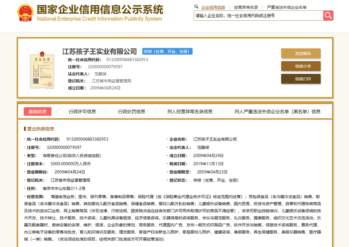 至今江苏孩子王的股权结构仍未发生变化,上述代持关系或尚未解除。虽然招股书披露江苏孩子王未再从事任何业务,且已通过决议启动清算注销程序。但公开信息显示江苏孩子王尚未注销,而其经营范围中仍包含婴幼儿配方食品、乳粉销售等与孩子王业务重合的部分。
