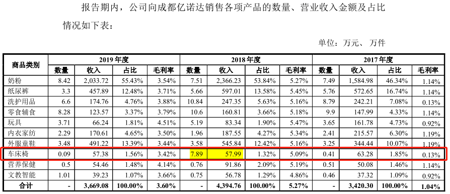 2017年,孩子王向南京亿诺达企业管理有限公司、成都亿诺达企业管理有限公司(下称“成都亿诺达”)、青岛亿诺达企业管理有限公司、西安亿诺达企业管理有限公司、郑州亿童联企业管理咨询有限公司销售母婴产品合并交易金额3,800.86万元。2018、2019年,孩子王分别向成都亿诺达销售母婴产品4,394.77万元、3,669.08万元。