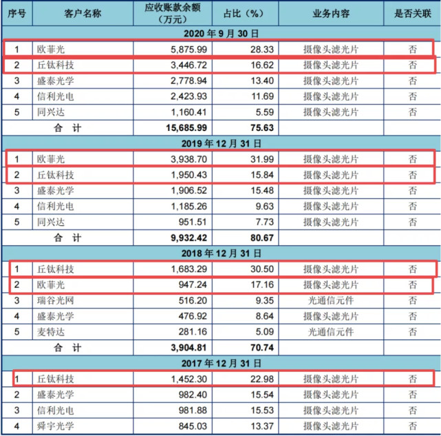 第二大客户丘钛科技在2017年、2018年的应收账款列表中均排名第一,金额分别为1452.3万元、1683.29 万元,占比分别为22.98 %,30.50%;2019年及2020年前三季度,均排名第二,金额分别为1950.43万元、3446.72万元,占比分别为15.84 %,16.62%。