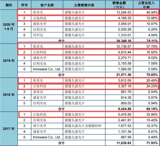 招股书显示,2017年到2020年前三季度,东田微向前五大客户的销售额分别为1.16亿元、0.94亿元、2.16亿元、2.43亿元,占营收比例分别为71.93%、69.19%、75.85%、75.11%。