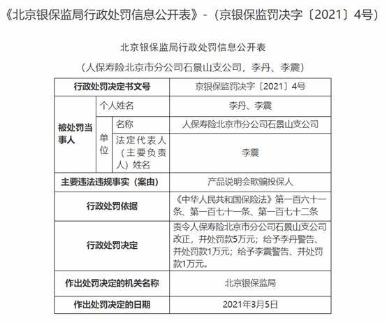 人保寿险北京石景山支公司违法遭罚 欺骗投保人