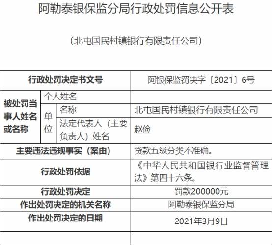 中国经济网北京3月17日讯 银保监会网站昨日发布阿勒泰银保监分局行政处罚信息公开表(阿银保监罚决字〔2021〕6号、7号、8号)显示,北屯国民村镇银行有限责任公司(以下简称“北屯国民村镇银行”)存在贷款五级分类不准确违法违规事实,阿勒泰银保监分局于2021年3月9日决定对该行罚款20.00万元,行政处罚依据为《中华人民共和国银行业监督管理法》第四十六条。
