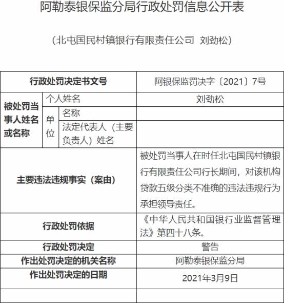 刘劲松在时任北屯国民村镇银行行长期间,对该机构贷款五级分类不准确的违法违规行为承担领导责任。阿勒泰银保监分局于2021年3月9日决定对刘劲松警告,行政处罚依据为《中华人民共和国银行业监督管理法》第四十八条。
