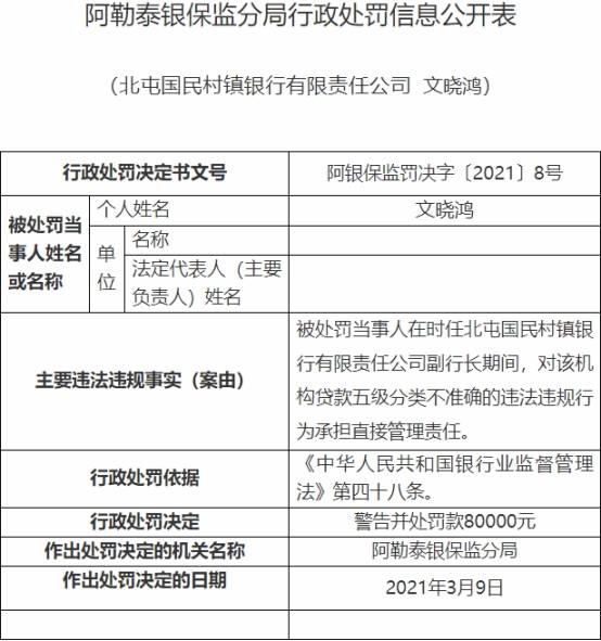 文晓鸿在时任北屯国民村镇银行副行长期间,对该机构贷款五级分类不准确的违法违规行为承担直接管理责任。阿勒泰银保监分局于2021年3月9日决定对文晓鸿警告并处罚款8.00万元,行政处罚依据为《中华人民共和国银行业监督管理法》第四十八条。