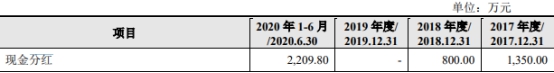 2017年、2018年、2020年1-6月,公司分别进行现金分红1350.00万元、800.00万元、2209.80万元。