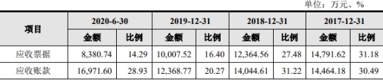 2017年至2020年1-6月,有研粉材应收票据分别为1.48亿元、1.24亿元、1.00亿元、8380.74万元,占流动资产比例分别为31.18%、27.48%、16.40%、14.29%;同期应收账款账面价值分别为1.45亿元、1.40亿元、1.24亿元、1.70亿元,占各期末流动资产的比例分别为30.49%、31.22%、20.27%、28.93%,占当期主营业务收入的比例分别为8.82%、7.81%、7.23%、23.05%。