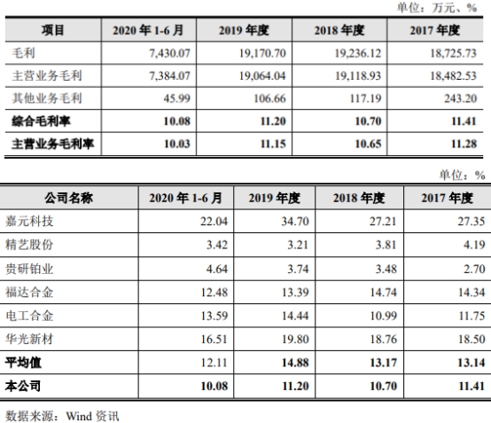 2017年至2020年1-6月,有研粉材综合毛利率分别为11.41%、10.70%、11.20%、10.08%;主营业务毛利率分别为11.28%、10.65%、11.15%、10.03%。有研粉材表示,公司产品毛利率受原材料价格、产品结构、市场供需关系等诸多因素影响,如未来相关因素发生不利变化,可能导致公司毛利率下降,影响公司盈利水平。