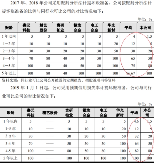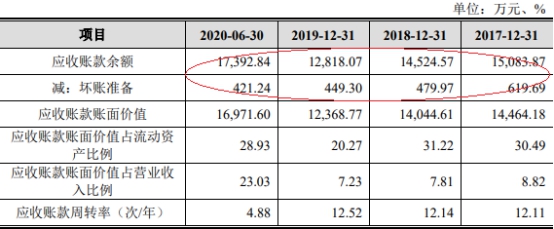 2017年至2020年1-6月,有研粉材应收账款余额分别为1.51亿元、1.45亿元、1.28亿元、1.74亿元,坏账准备分别为619.69万元、479.97万元、449.30万元、421.24万元。