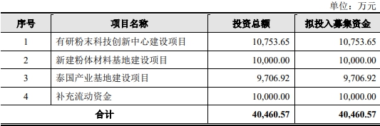 有研粉材此次于上交所科创板上市,公开发行3000.00万股,均为新股,无老股转让,发行价格为每股10.62元。有研粉材此次募集资金总额为3.19亿元,扣除发行费用后,募集资金净额为2.84亿元。与有研粉材2021年3月12日披露招股书数据对比,公司实际募资减少1.21亿元。据招股书,有研粉材拟募集资金金额为4.05亿元,分别用于有研粉末科技创新中心建设项目、新建粉体材料基地建设项目、泰国产业基地建设项目、补充流动资金。