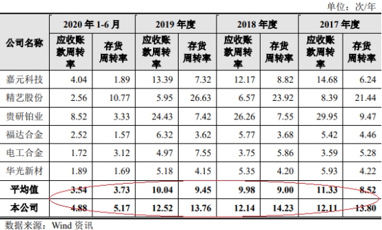 2017年至2020年1-6月,有研粉材应收账款周转率分别为12.11次、12.14次、12.52次、4.88次,同期行业均值分别为11.33次、9.98次、10.04次、3.54次;有研粉材存货周转率分别为13.80次、14.23次、13.76次、5.17次,行业均值分别为8.52次、9.00次、9.45次、3.73次。