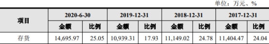 2017年至2020年1-6月,有研粉材存货账面余额分别为1.14亿元、1.11亿元、1.09亿元、1.47亿元;同期,有研粉材存货账面价值分别为1.14亿元、1.11亿元、1.09亿元、1.47亿元,占流动资产比例分别为24.04%、24.78%、17.93%、25.05%。