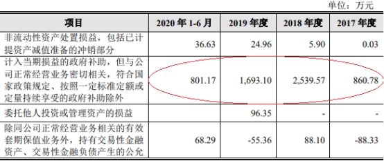2017 年至2020年1-6月,有研粉材获得计入非经常性损益的政府补助分别为860.78万元、2539.57万元、1693.10万元、801.17万元,分别占利润总额的13.67%、34.91%、26.06%、24.70%。
