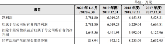 2017年至2020年1-6月,有研粉材净利润分别为5528.21万元、6453.83万元、6019.23万元、2781.80万元,归母净利润分别为4664.81万元、6229.04万元、6019.23万元、2781.80万元,扣非后归母净利润分别为4127.96万元、3992.04万元、4461.93万元、1643.56万元,经营活动产生的现金流量净额分别为2652.95万元、8233.09万元、-972.12万元、818.94万元。