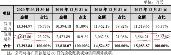 2017年至2020年1-6月,有研粉材信用期外应收账款分别为3564.21万元、3062.38万元、2423.89万元、4047.86万元,占比分别为23.63%、21.08%、18.91%、23.27%。
