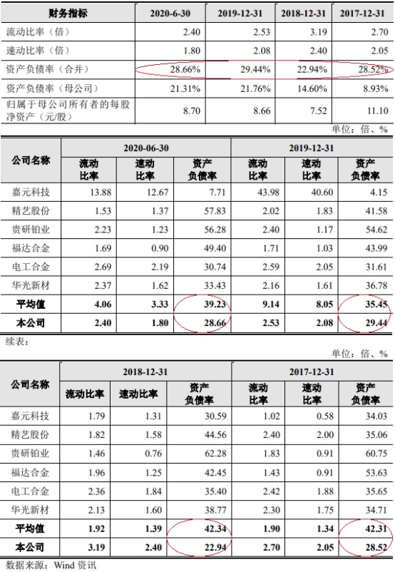 2017年至2020年1-6月,有研粉材资产负债率(合并)分别为28.52%、22.94%、29.44%、28.66%,同期行业均值分别为42.31%、42.34%、35.45%、39.23%。
