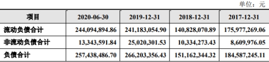 2017年至2020年1-6月,有研粉材负债合计分别为1.85亿元、1.51亿元、2.66亿元、2.57亿元,其中,流动负债分别为1.76亿元、1.41亿元、2.41亿元、2.44亿元。