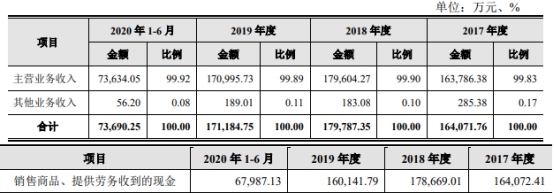2017年至2020年1-6月,有研粉材营业收入分别为16.41亿元、17.98亿元、17.12亿元、7.37亿元,其中,主营业务收入分别为16.38亿元、17.96亿元、17.10亿元、7.36亿元;销售商品、提供劳务收到的现金分别为16.41亿元、17.87亿元、16.01亿元、6.80亿元。