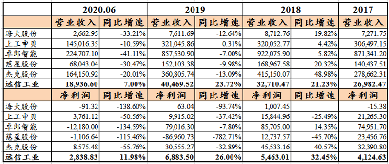 据招股说明书披露,远信工业同业可比上市公司有杰克股份、慈星股份、卓郎智能、上工申贝和海大股份,本文根据Wind数据披露的上述可比上市公司的营业收入和净利润整理如下表所示: