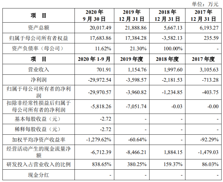 财务数据显示,首药控股2017年、2018年、2019年、2020年前9月营收分别为3,105.63万元、1,997.60万元、1,154.76万元、701.91万元;同期对应的净利润分别为-713.28万元、-2181.53万元、-3598.57万元、-2.30亿元。