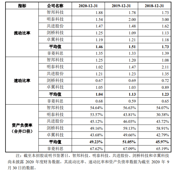 界面新闻记者注意到,报告期各期末,菲菱科思公司(合并)资产负债率分别为65.19%、67.09%和67.62%,资产负债率较高,高于同行业平均值,并且流动比率和速动比率均低于同行业可比上市公司平均值。