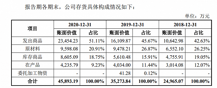 界面新闻记者注意到,报告期内,菲菱科思的存货结构主要为发出商品、原材料和库存商品,上述存货合计占总存货的比重在90%左右,其中发出商品占比最重。