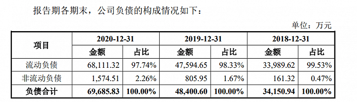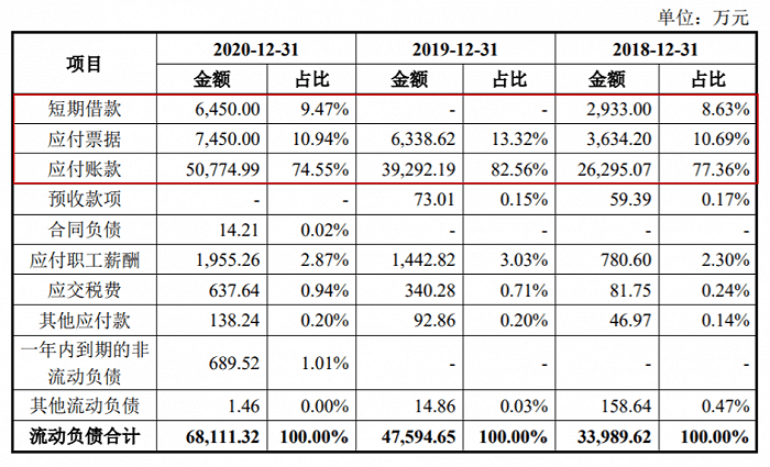 招股书显示,菲菱科思负债主要为流动负债,负债规模呈增长趋势,负债主要由短期借款、应付票据及应付账款构成,报告期各期末,上述负债占流动负债的比重均超过90%,其中应付账款占比最重,分别为26,295.07万元、39,292.19万元和50,774.99万元,占流动负债的比例分别为77.36%、82.56%和74.55%,主要为应付供应商的材料款。