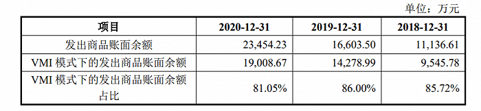 招股书披露,菲菱科思发出商品主要为VMI模式下的发出商品。报告期各期末,菲菱科思发出商品账面余额分别为11,136.61万元、16,109.87 万元和23,454.23万元,而VMI模式下的发出商品账面余额分别为9,545.78万元、14,278.99万元和19,008.67万元,占比分别为85.72%、86.00%和81.05%。
