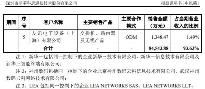 招股书显示,报告期内,菲菱科思前五大客户的销售金额占营收的比例分别为93.63%、97.59%、99.45%。其中对新华三的销售金额占营收比例分别为84.79%、87.55%和80.00%,均在八成以上,客户集中度较高。