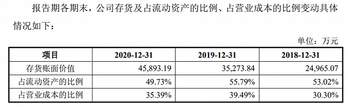 招股书显示,报告期各期末,菲菱科思存货的账面价值分别为24,965.07万元、35,273.84万元和45,893.19万元,存货规模整体呈上升趋势,存货账面价值占营业成本的比例分别为 30.30%、39.49%和 35.39%,占流动资产的比例分别为 53.02%、55.79%和 49.73%。