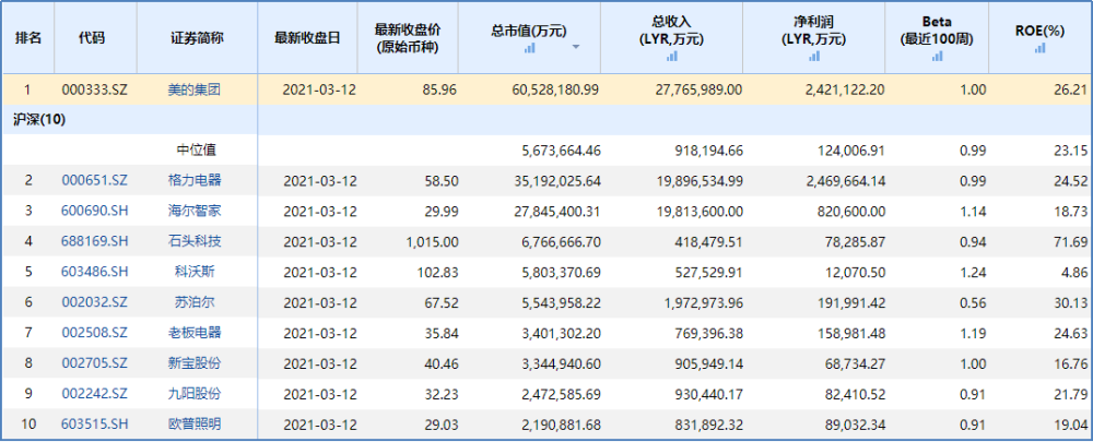 再从估值角度来看,截至3月12日,索菲亚和美的集团的总市值分别为297.98亿元和6052.82亿元,分列家装和电器行业的第三名和第一名,龙头地位显著。需要注意的是,同为白电寡头的美的集团和格力电器有着“不相上下”的盈利水平,如2019年度,其分别实现归母净利润242.11亿元和246.97亿元。但从市场表现来看,却明显不匹配。数据显示,截至3月12日,美的集团的总市值为6052.82亿元,格力电器仅为3519.20亿元。