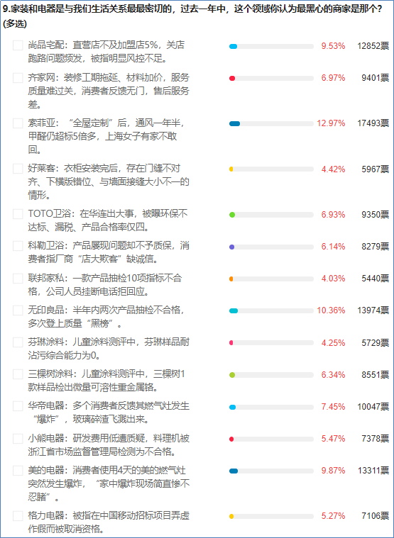 从消费者给出的理由来看,索菲亚和美的电器都存在严重的产品质量问题。如索菲亚的上榜理由是“‘全屋定制’后,通风一年半,甲醛仍超标5倍多,上海女子有家不敢回”美的电器是“消费者使用4天的美的燃气灶突然发生爆炸,‘家中爆炸现场简直惨不忍睹’”。