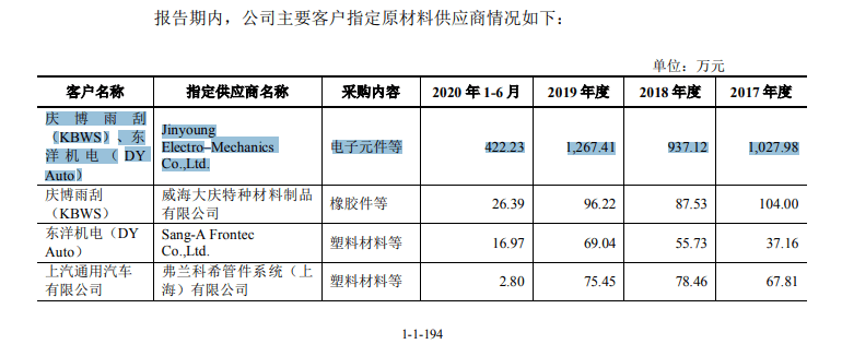 客户指定物料或从客户处采购指定物料为汽车行业惯例。造成了报告期内客户与供应商、客户与竞争对手重叠。以庆博雨刮(KBWS)指定的 Jinyoung Electro–Mechanics Co.,Ltd.为例。恒帅股份主要从Jinyoung采购继电器,继电器焊接在微电机的PCB 线路板上,用于控制微电机运作。