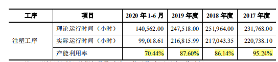 电机为公司产品的核心部件,可用于成品微电机、清洗泵、清洗系统的后续生产。2017年-2020年1-6月电机工序的产能利用率分别为96.82%、86.66%、93.90%和75.06%,下滑严重。注塑工序的产能利用率从2017年的95.24%下降到了2020年1-6月的70.44%。
