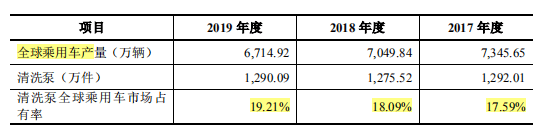 2017年至2019年,恒帅股份的清洗系统、清洗泵主要客户覆盖车型销量占全球乘用车产量的比例较高。公司微电机应用的主要汽车品牌占全球汽车销量的比例分别为19.90%、18.33%、17.78%。 通常情况下,一辆汽车只需装配一套清洗系统,一套清洗系统通常装配一个清洗泵。根据来源于同花顺iFinD全球乘用车产量数据推算,2017年至2019年公司清洗泵产品在全球乘用车市场的占有率分别为17.59%、18.09%、19.21%。恒帅股份称上述清洗泵全球乘用车市场占有率为基于若干合理假设计算,公司一级零部件供应商客户采购公司清洗泵后,可能存在当年未能全部实现销售的情况,亦可能存在未全部应用于整车厂的汽车生产的情况。若考虑上述情况,则公司实际清洗泵产品全球乘用车市场占有率可能低于上表测算的占有率。