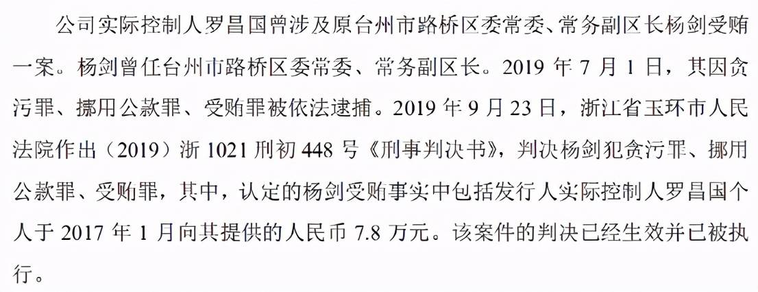 实际上,罗昌国还有一个重要身份。据浙江新闻于2020年9月3日发布的文章显示,罗昌国系路桥区的人大代表。这样一个光鲜的履历,公司为什么没有披露呢?这或许与罗昌国的违法行贿行为有关。