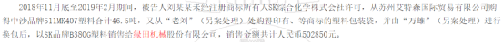 值得注意的是,报告期内绿田机械还曾采购大量假冒原材料用于生产。据(2020)浙0281刑初324号裁判文书显示,2018年11月底至2019年2月期间,被告人刘某某未经注册商标所有人SK综合化学株式会社许可,从苏州艾特森国际贸易有限公司购得46.5吨中沙品牌511MK407塑料,又从“老刘”处购得印有商标的塑料包装袋,由“万雄”进行换包后,以SK品牌B380G塑料销售给绿田机械,销售金额共计人民币502850元。