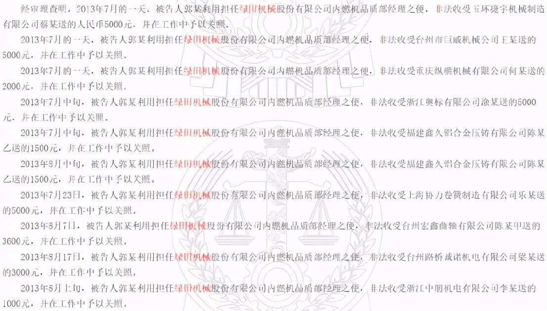 另据(2014)台路刑初字第31号裁判文书显示,被告人郭某利用担任绿田机械内燃机品质部经理之便,非法收受玉环捷宇机械制造有限公司蔡某等人赠送的人民币31100元,并在工作中予以关照。