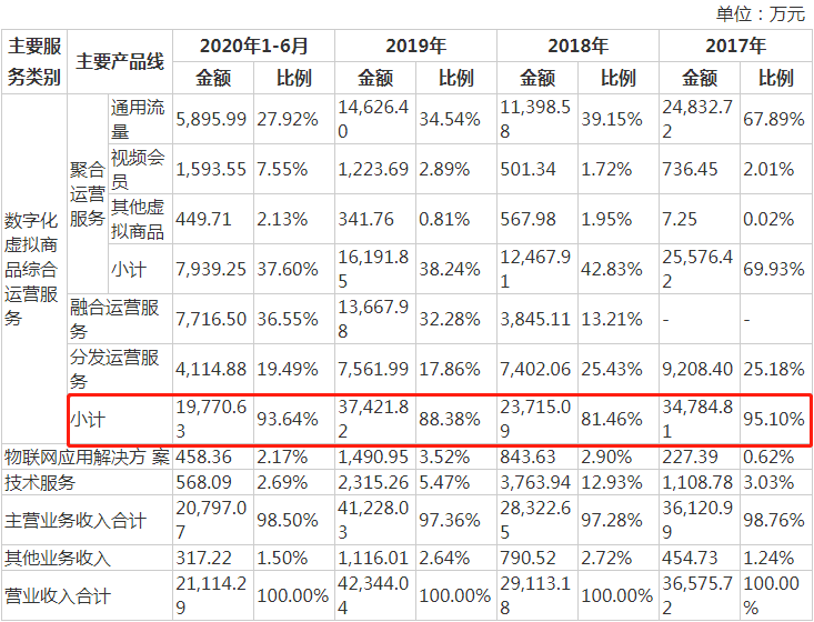 据招股书披露,2017-2020年上半年,蜂助手来自数字化虚拟商品综合运营服务的销售收入分别为3.48亿元、2.37亿元、3.74亿元和1.98亿元,占营业收入的比例分别为95.10%、82.46%、88.38%和93.64%。蜂助手的业务集中度较高,或为其带来一定的业绩风险。