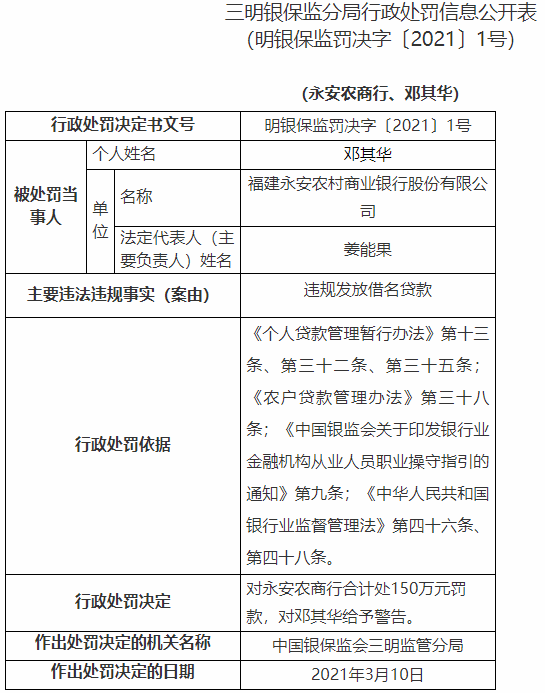 根据《个人贷款管理暂行办法》第十三条、第三十二条、第三十五条,《农户贷款管理办法》第三十八条,《中国银监会关于印发银行业金融机构从业人员职业操守指引的通知》第九条,《中华人民共和国银行业监督管理法》第四十六条、第四十八条,中国银保监会三明监管分局对福建永安农商行合计处150万元罚款,对邓其华给予警告。