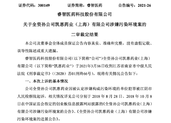 3月17日,睿智医药还公布了关于全资孙公司凯惠药业(上海)有限公司涉嫌污染环境案的二审裁定结果。