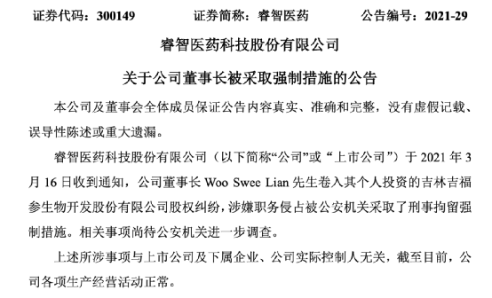 3月17日晚间,睿智医药(300149)发布公告称,公司于2021年3月16日收到通知,公司董事长Woo Swee Lian(胡瑞连)卷入其个人投资的吉林吉福参生物开发股份有限公司股权纠纷,涉嫌职务侵占被公安机关采取了刑事拘留强制措施,相关事项尚待公安机关进一步调查。
