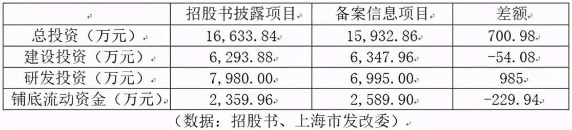 对比发现,招股书披露的项目总投资金额为16,633.84万元,而备案信息显示的则是15,932.86万元,比招股书披露的金额少了700.98万元。细分到每一项投资概算,对照建设投资计算,备案信息公示相比招股书披露多出了54.08万元;在铺底流动资金的信息披露上,备案信息公示也比招股书要多229.94万元;而在研发投资上,备案信息公示的金额则比招股书披露的金额少了985万元之多。