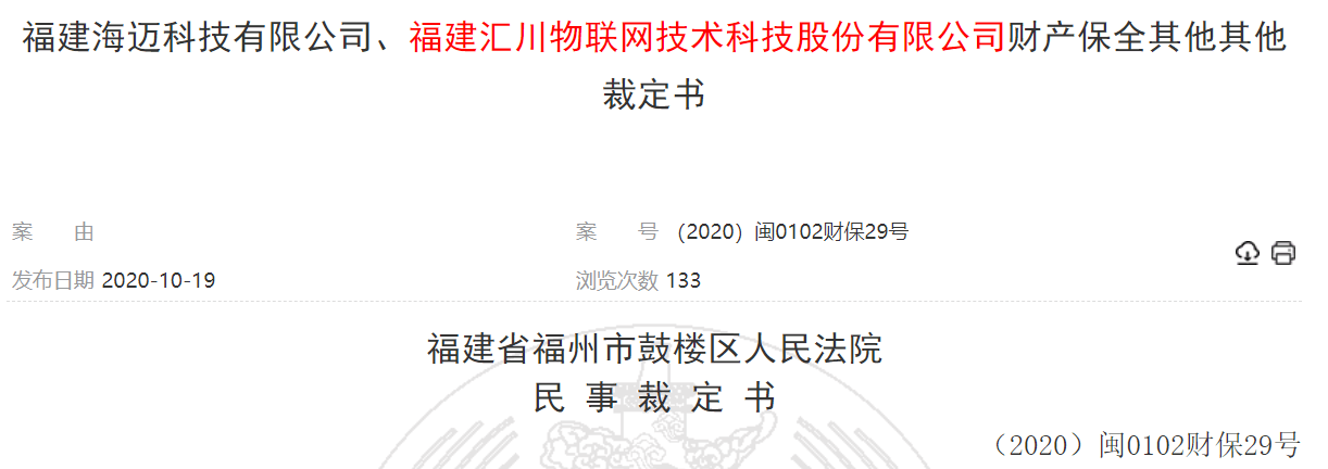 根据《裁判文书网》发布的《福建海迈科技有限公司、福建汇川物联网技术科技股份有限公司财产保全其他其他裁定书》【(2020)闽0102财保29号】,福建海迈科技有限公司在2020年9月申请财产保全,查封、扣押、冻结被申请人福建汇川物联网技术科技股份有限公司名下财产,保全价值以1102616.43元为限。