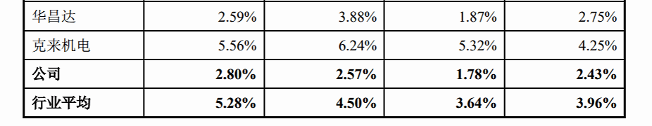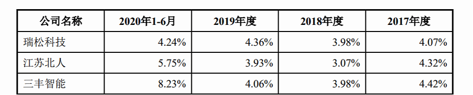 招股书显示,相关同行的研发费用率均值分别为3.85%、3.68%、4.49%、5.28%,行业平均为3.96%
