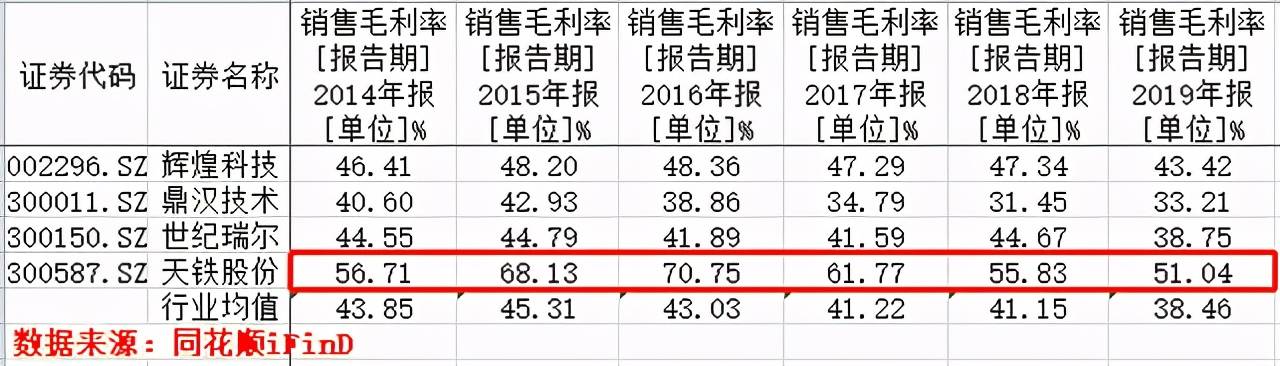 天铁股份所处行业领域内同等销售规模的三家上市公司辉煌科技、鼎汉技术、世纪瑞尔,2014-2019年平均毛利率大致在38%-45%之间,天铁股份明显高出不少。