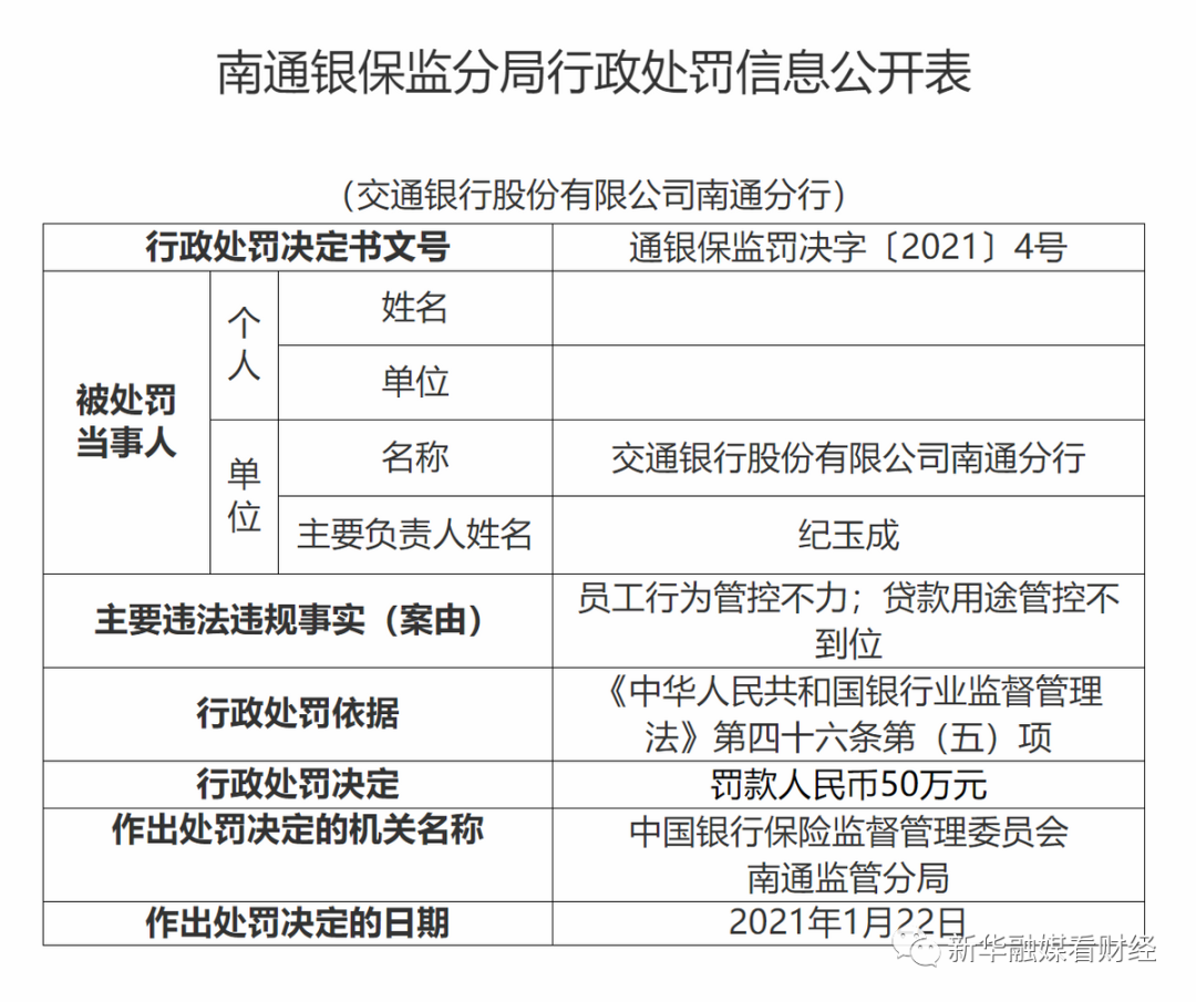 截至3月18日,交通银行淮安分行、义乌分行、南通分行、韶关分行四家分行均因贷款资金流向和管控问题收到银保监开具的罚单,最高罚款达50万元。