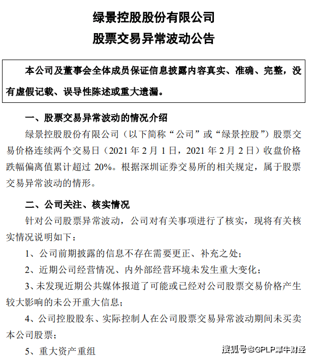 2月3日,绿景控股(000502.SZ)发布股票交易异常波动公告表示,已披露信息不存在需要更正和补充之处;经营情况和内外部环境未有变化;控股股东和实控人并未买卖股票等。